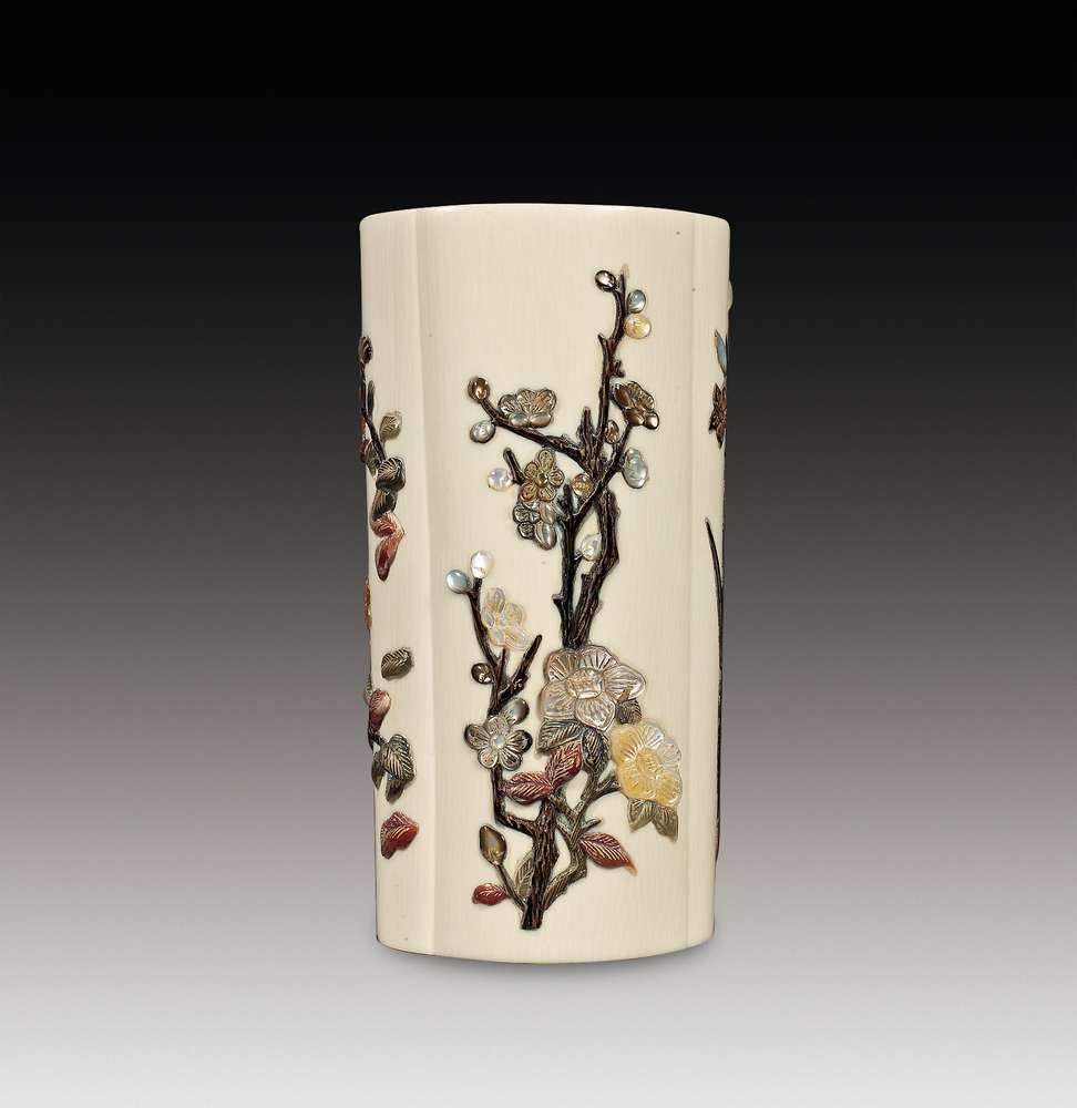 象牙嵌百宝花开富贵笔筒