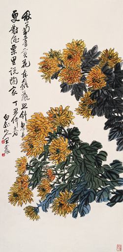 花谱曾名寿客,石头亦解禅机。漫说秋落莫,相对信觉芳菲。壬申重九,白龙山人王震写。