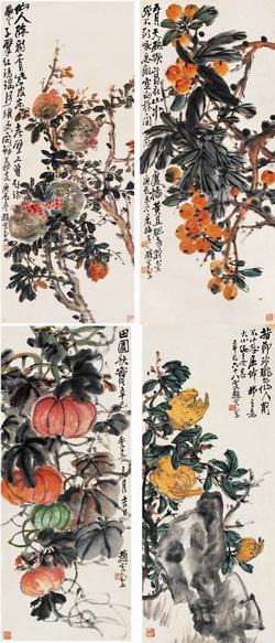 (1)指节玲珑正,仙人削不成。屈伸那足意,大小总无名。辛巳,叟赵云壑;(2)五月天热换菖衣,山中卢橘黄且肥。多凝金弹不欲啄,忍饥空向林间飞。庚辰立冬,泉梅老人赵云壑;(3)仙人醉剥青紫皮,东春壁上曾题诗。累累子擘红玛瑙,何须更问鲜荔枝。庚辰冬,赵云壑。(4)田园秋实.辛巳季春之月吉日