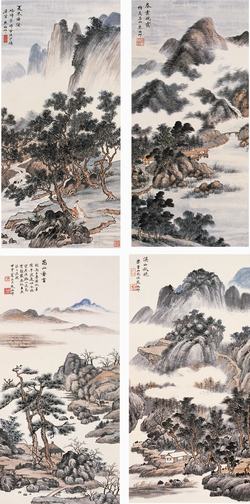 (1)夏木垂阴。略师李晞古法于端居室。朱梅邨。(2)万山香雪,倪高士专用水墨,写平陂远岫今偶变其法施以设色。有类戴鹿??王东??之流钦。甲申夏五月朱梅邨。(3)溪山秋晓,学董北苑法。朱梅邨(4)春云晓蔼,仿高房山。朱梅邨 |