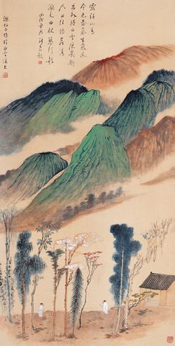 (1)谢伯子作于白云溪上。(2)露余青山,金色氤氲。生气远出如将白云。庶几斯人,日往烟舞。清涧之曲,杖藜行歌。丙戊暑月,?小山题。