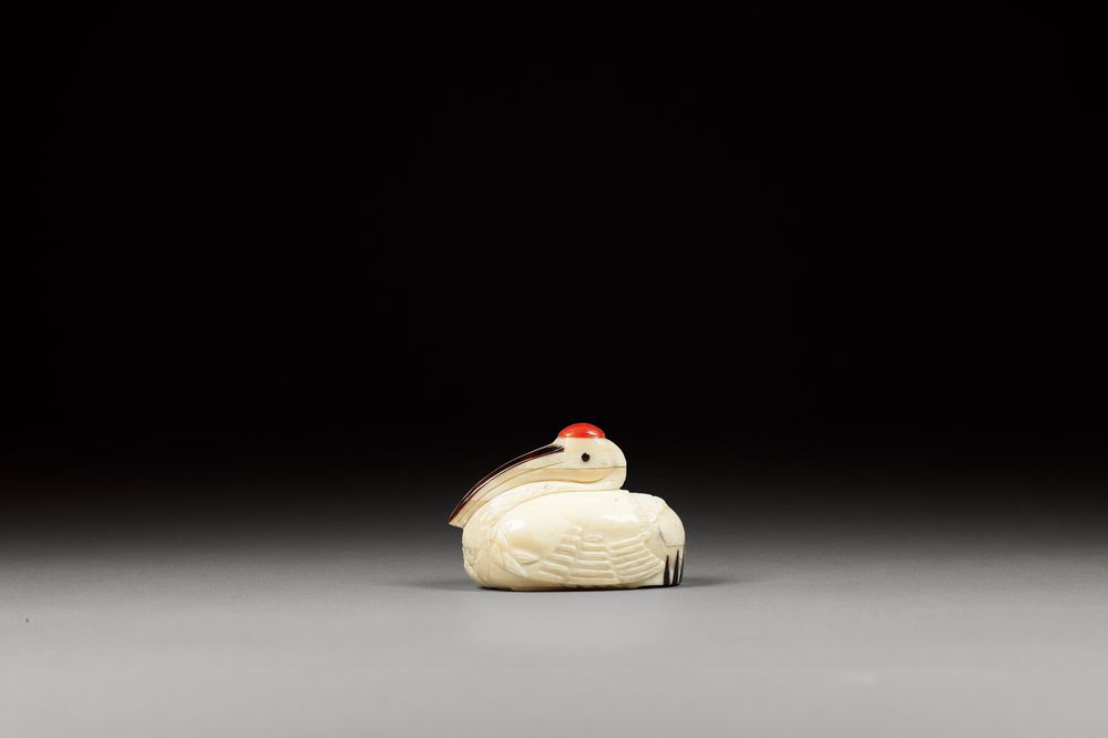 -> 骨雕卧鹤形鼻烟壶