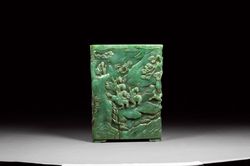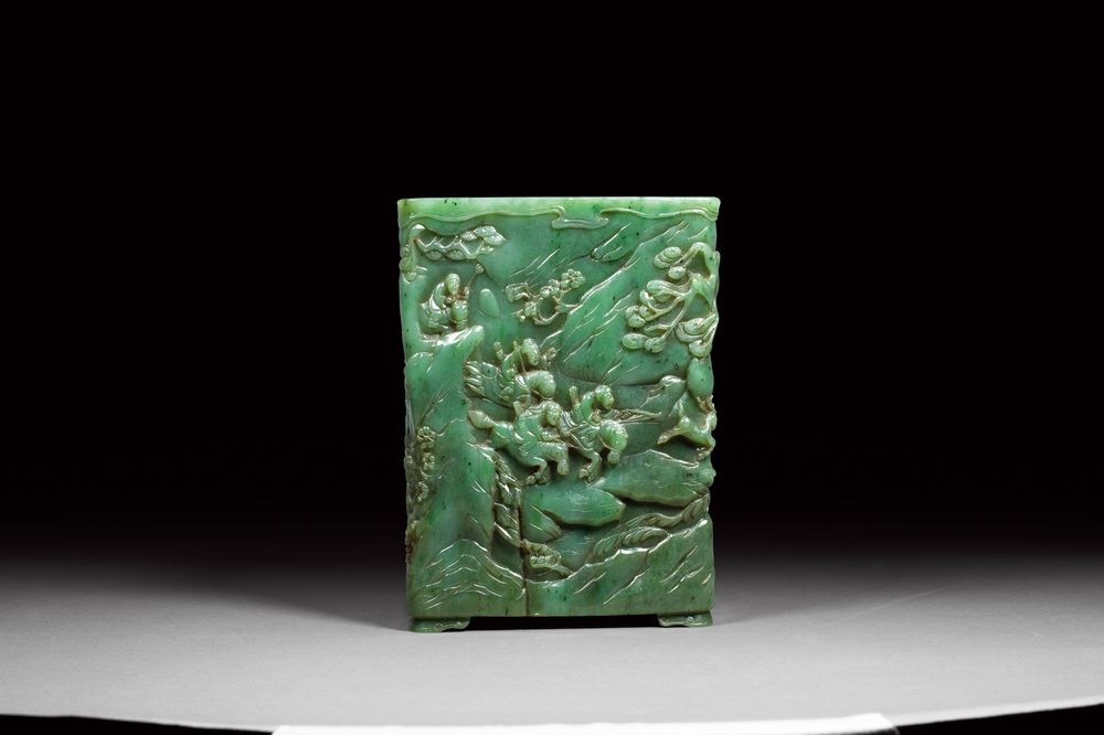 -> 和田碧玉浮雕狩猎图四方笔筒