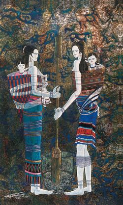 这幅作品反映的就是在清晨天色刚明时分,两名妇女背着孩子摏米,两人密切无间的合作,恰如一曲充满活力和生气的歌谣,不但反映着少数民族的生活习俗,也借由平凡的场景表现生活之美,以及母亲的劳作,整幅作品中充满着人情味。
