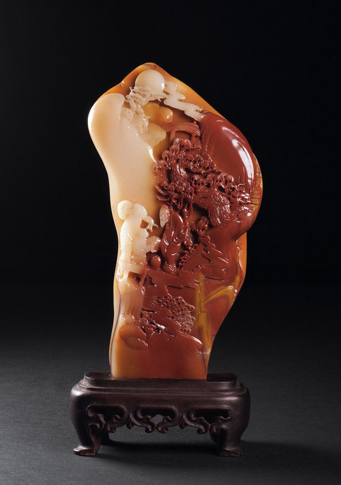 寿山芙蓉留皮巧色松下闲趣图摆件
