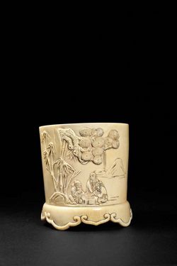 -> 象牙浮雕松下对弈如意足笔筒