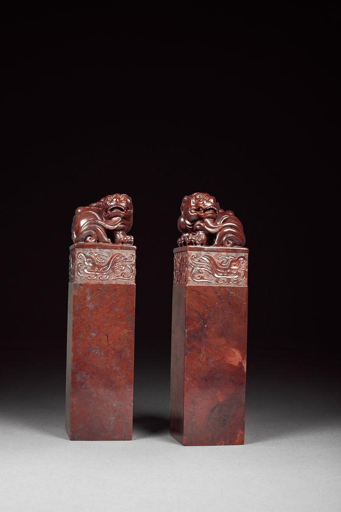 -> 寿山月尾石兽钮印章一对
