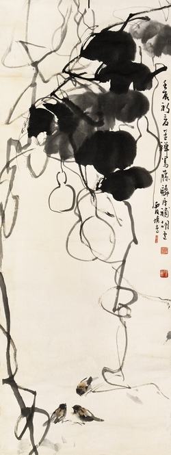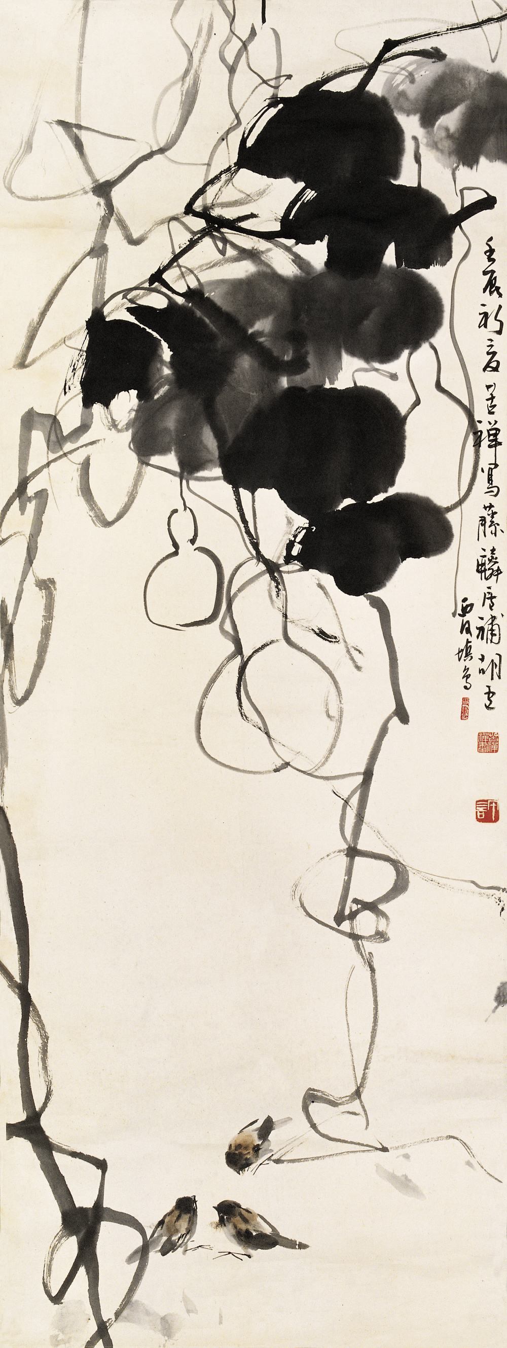 壬辰新夏苦禅写藤,麟庐补葫芦,西河填鸟