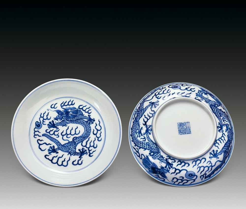 青花双龙戏珠纹盘一对