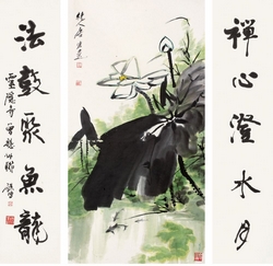 -> 荷荫游鱼图、行书对联