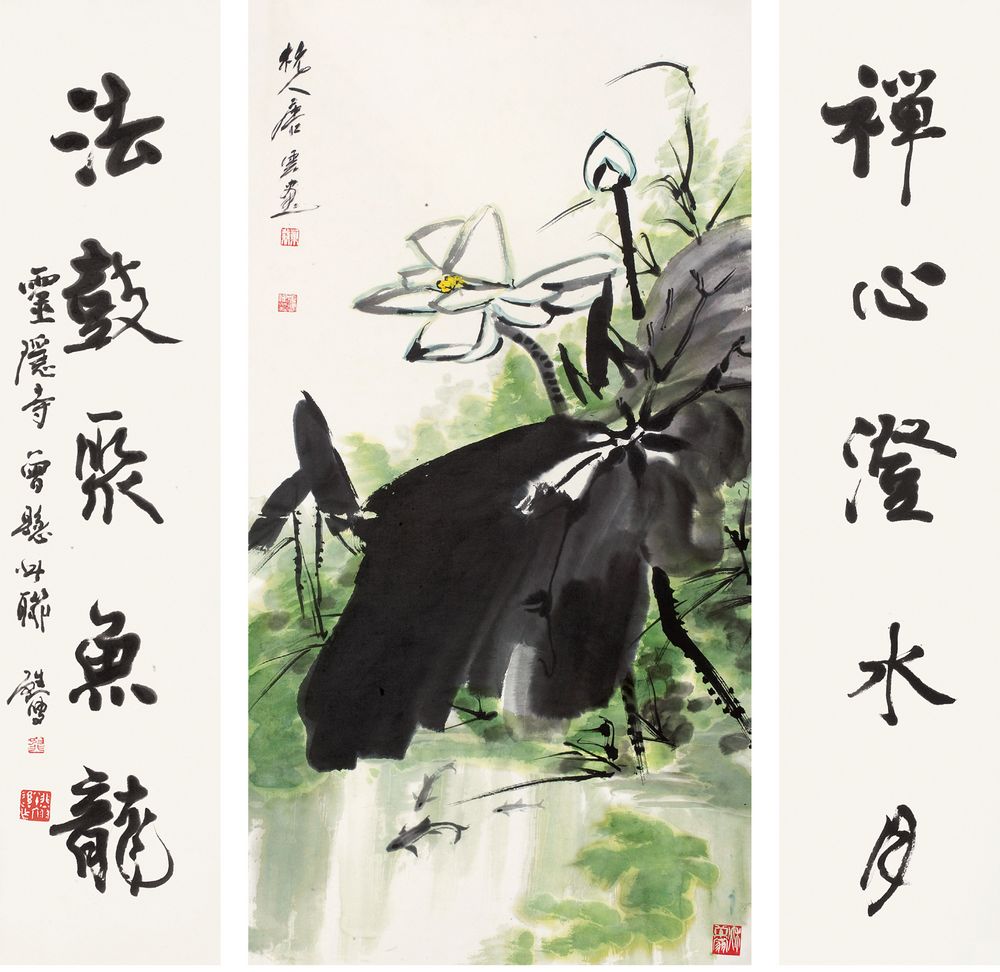 荷荫游鱼图、行书对联