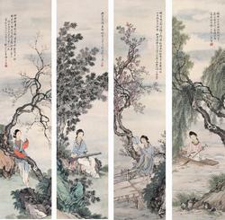 (1)昨宵风雨到溪头,目断飞红逐水流。妒煞寻香双蛱蝶,一生花里不知愁。仿费晓楼先生笔法,挹兰外史仲光勋。(2)好与梅华结比邻,云环斜射写半神,粉痕浅浅脂痕薄,疑是罗浮梦?人。时在壬子立夏节前一日,以为笃初仁兄大人法家正之,梅泾小梅弟仲光勋。(3)幽篁琴韻。略师仇实父画意,绮石馆主小梅氏。(4)杨柳丝长水满塘,野风瑟瑟藕花香。吴影一如烟波渺,荡槳渔娃归夕阳。小梅写。 |