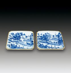 -> 青花山水人物描金倭角盘一对