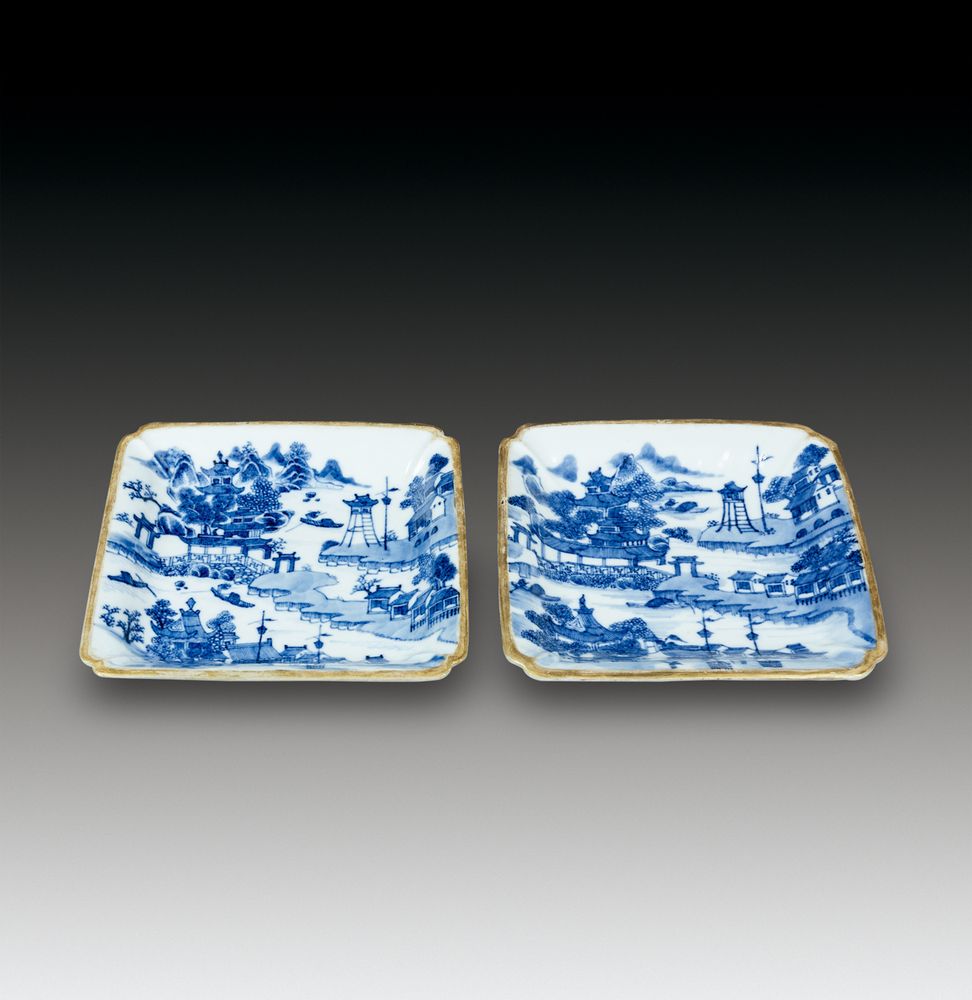 青花山水人物描金倭角盘一对