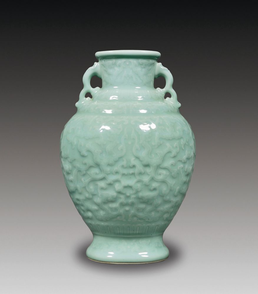 粉青釉夔龙双耳罐